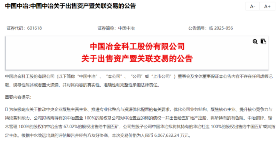 12月8日晚间,中国中冶发布公告,计划以606.76亿元总价,将旗下中冶置业、中冶铜锌、瑞木管理等核心资产打包出售给控股股东中国五矿集团及其关联方。