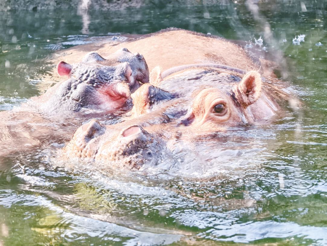 河马在“温泉”中惬意游动。