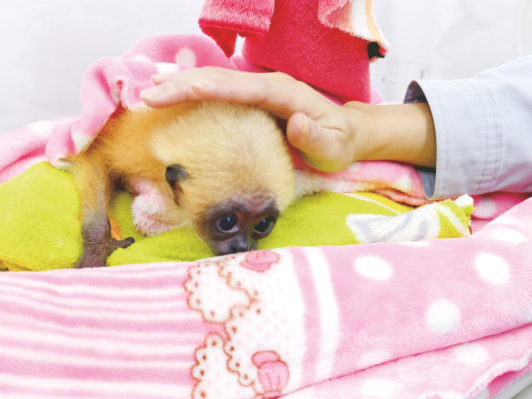 工作人员为长臂猿幼崽裹上毛毯。