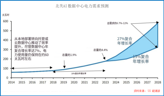 按照这一预测,从2023到2028年,其AI数据中心的电力需求有望增长2-3倍。