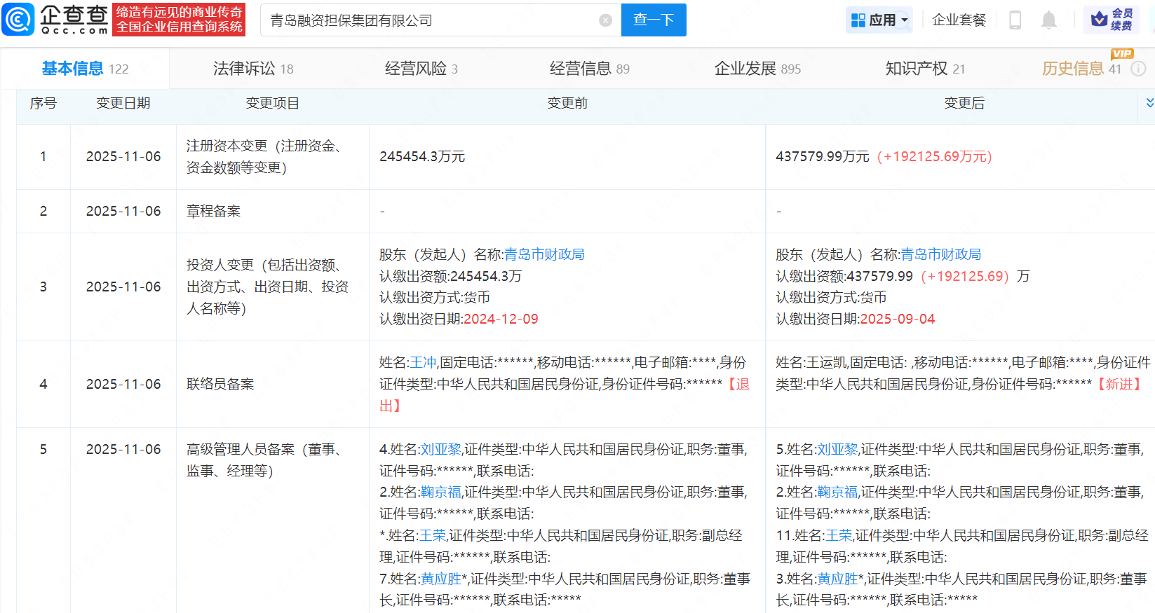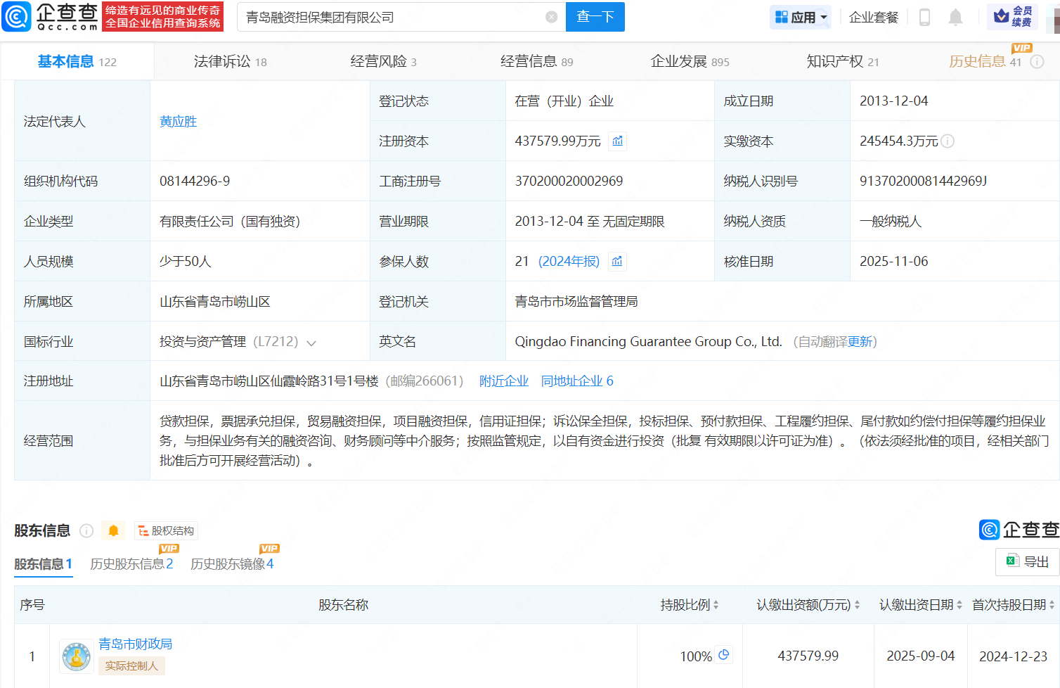 近日,青岛融资担保集团有限公司发生工商变更,注册资本由约24.5亿元增至约43.8亿元,增幅约78%。同时,多位主要人员发生变更。企查查信息显示,该公司成立于2013年12月,法定代表人为黄应胜,经营范围包含贷款担保、票据承兑担保、贸易融资担保、项目融资担保等,由青岛市财政局全资持股。